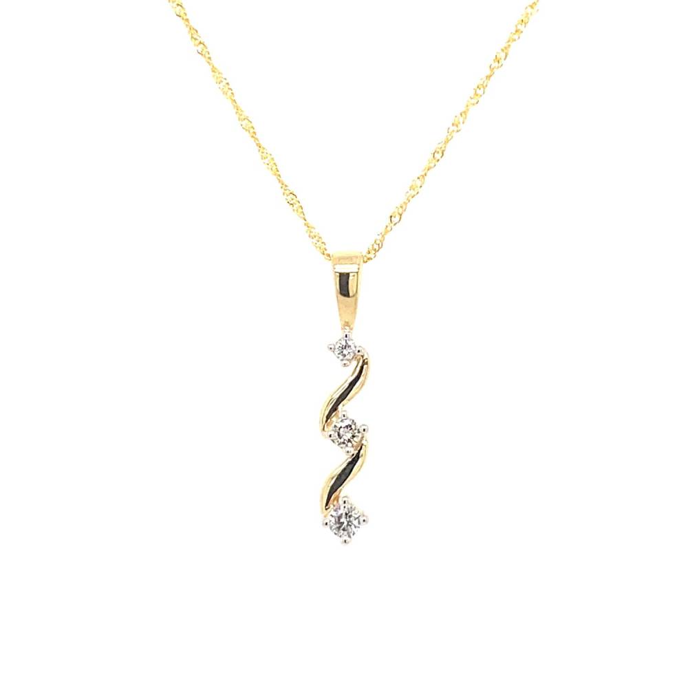9ct yellow gold wavy drop pendant set with three round brilliant cut diamonds on a 9ct yellow gold 18″ chain.