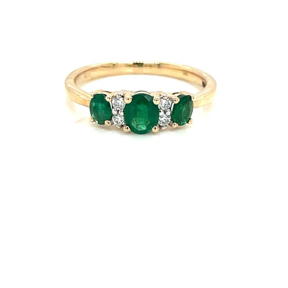 Three graduated oval emeralds with two diamonds between each claw set in a 9ct yellow gold ring mount. 0.74ct total emerald weight and 0.07ct total diamond weight.