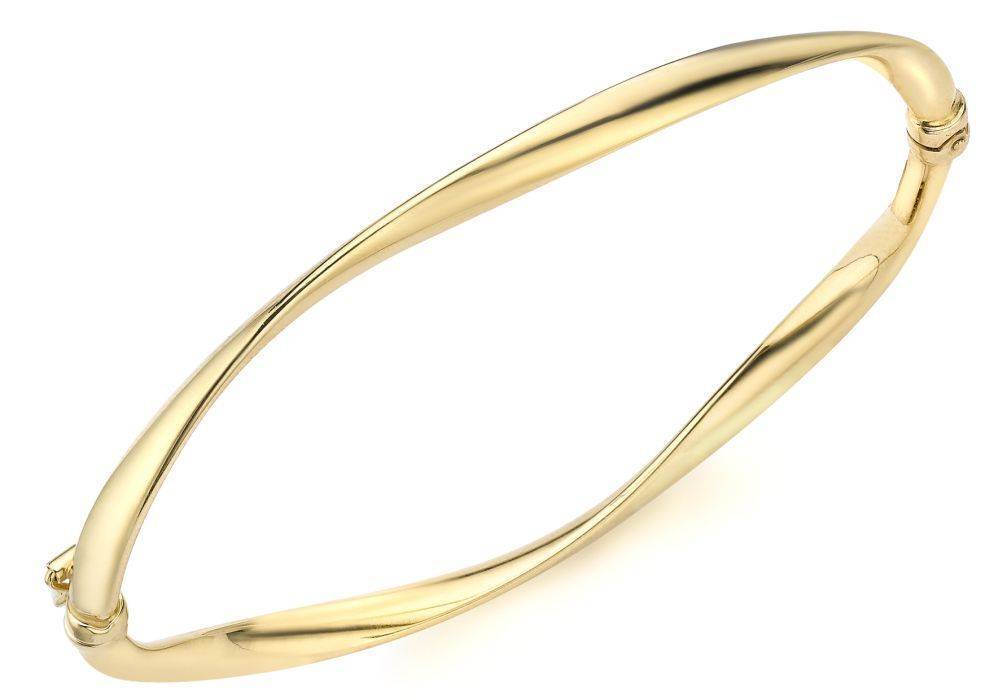 9ct yellow gold hollow twist deisgn polished hinged bangle. 60mm x 52mm.