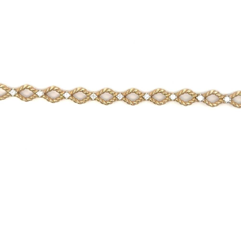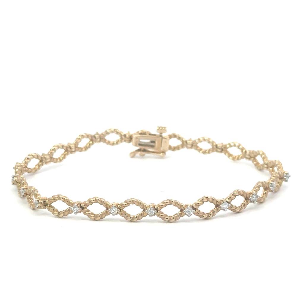 9ct yellow gold open twisted links each set with a round brilliant cut diamond between. This bracelet has a push in catch and safety arm. 0.42ct total diamond weight.