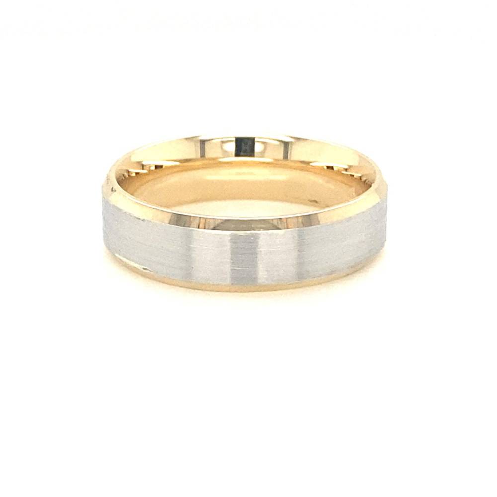9ct yellow gold wedding ring with a brushed white gold centre and polished yellow gold edges. The perfect mix of the two colours of gold. This ring is seen here is 6mm but is available in other widths and also other precious metals. Please enquiry for more details and prices.