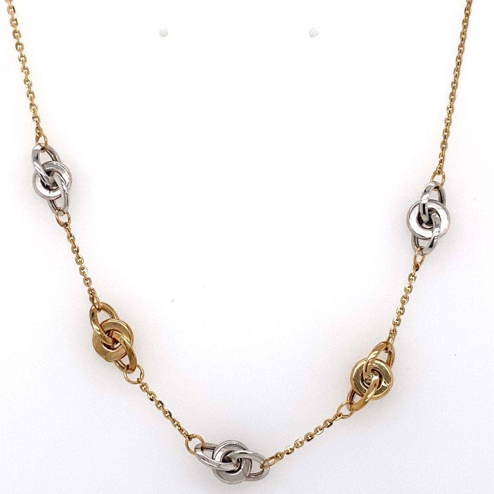 9ct yellow and white gold necklace. A 9ct yellow gold trace chain with 5 sets of three interlocking circles equally spaced at the front section of the necklace in yellow and white gold. Adjustable length 43-45cm.