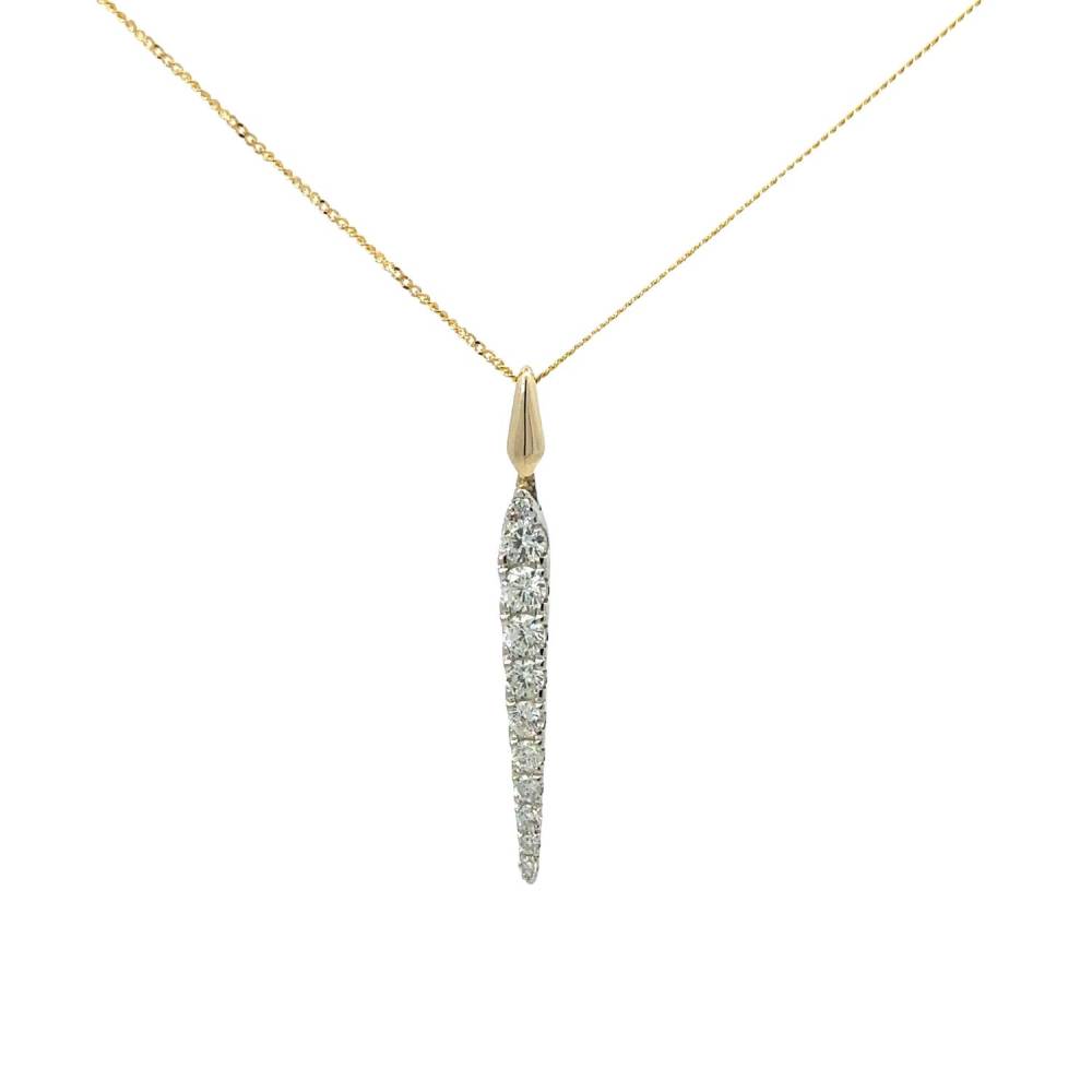 An elongated point 9ct yellow and white gold pendant set with graduated round brilliant cut diamonds. This pendant comes on a 46cm chain. 0.45ct total diamond weight.