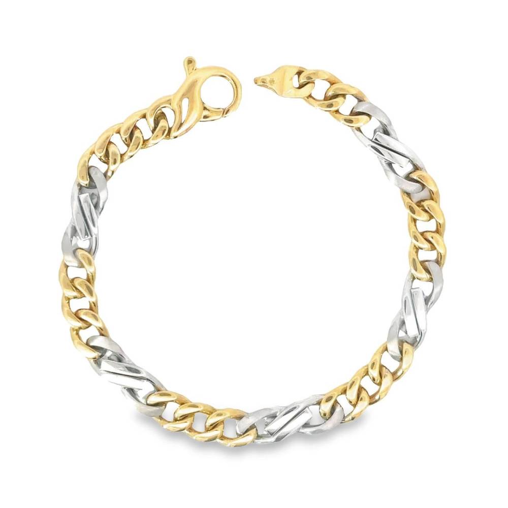 9ct yellow and white gold two tone fancy curb link solid bracelet with a feature catch.