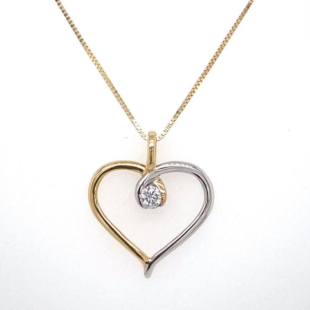9ct yellow and white gold half and half open heart pendant with a round briilliant cut diamond in the centre on a 9ct yellow gold 18″” box chain.