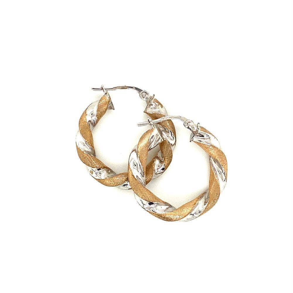 9ct yellow and white gold satin and polished twist design hoop earrings.