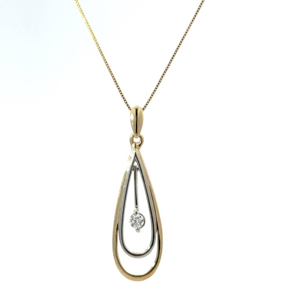 9ct yellow and white gold two tone double open teardrop pendant set with a single round brilliant cut diamond (0.10ct). This pendant comes on a 9ct yellow gold 18″ chain.