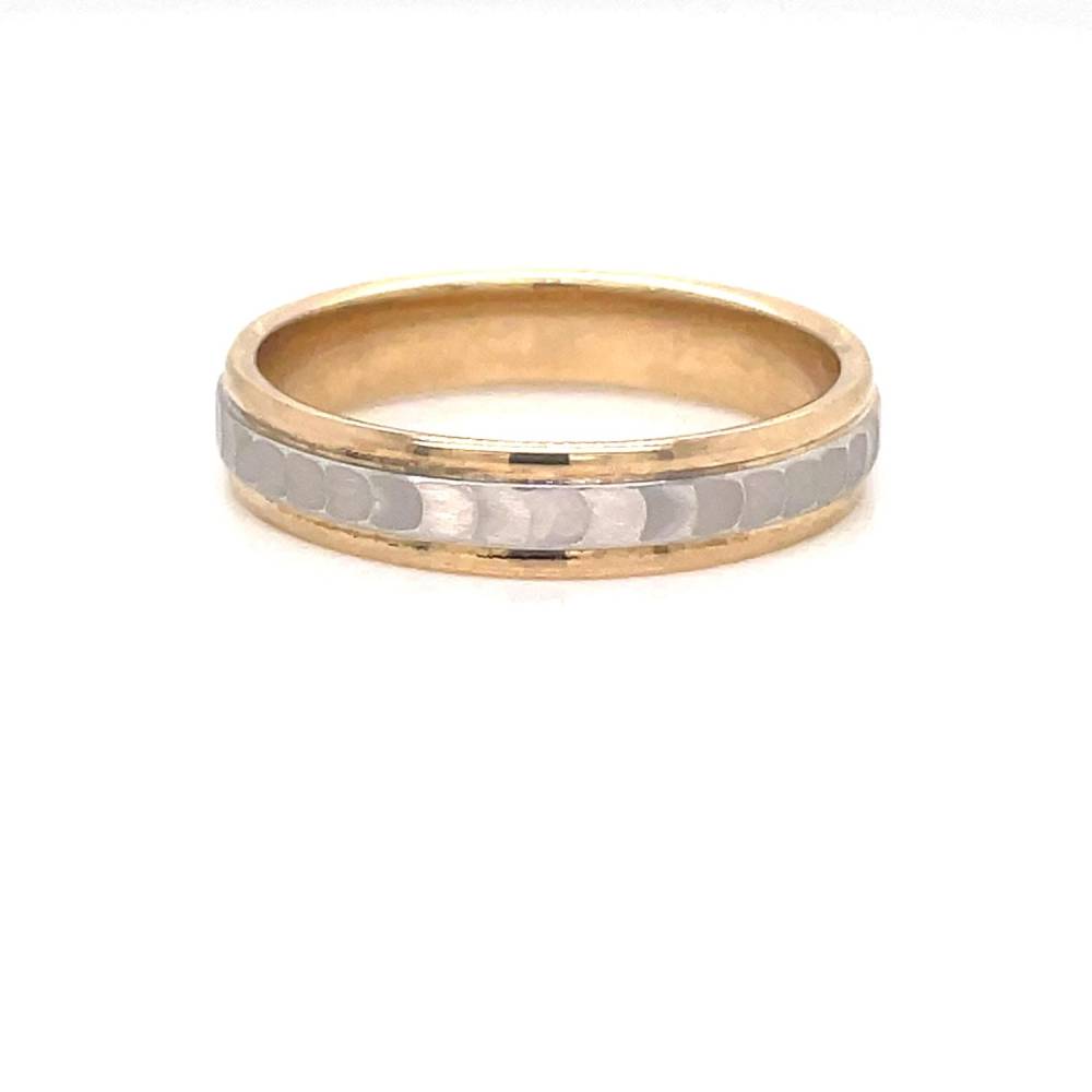 9ct yellow gold wedding ring with a white gold wave design pattern centre. This ring is 4mm wide and is available in different widths and all precious metals. Please enquire for more details and prices.