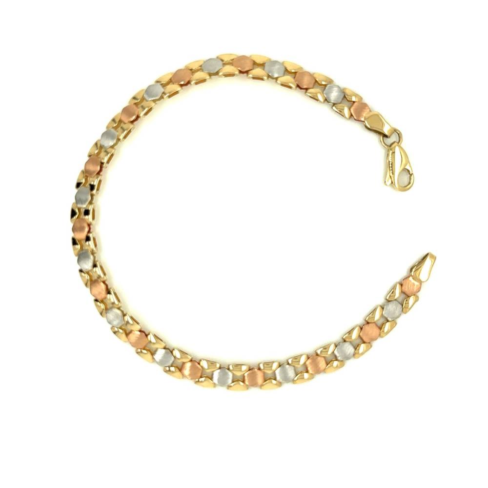 9ct yellow, white and rose gold three colour fancy link flat bracelet.