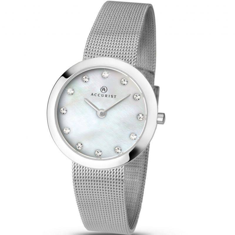 Accurist ladies stainless steel watch with a round mother of pearl dial with sparkling cubic zirconia on a stainless steel mesh bracelet. Powered by a quartz movement.