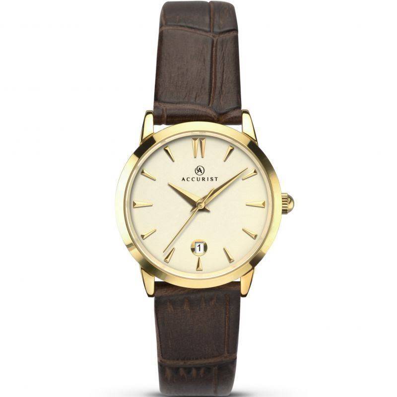 Accurist ladies gold plated watch with a round cream dial with gold tone batons on a brown leather strap. Powered by a quartz movement.