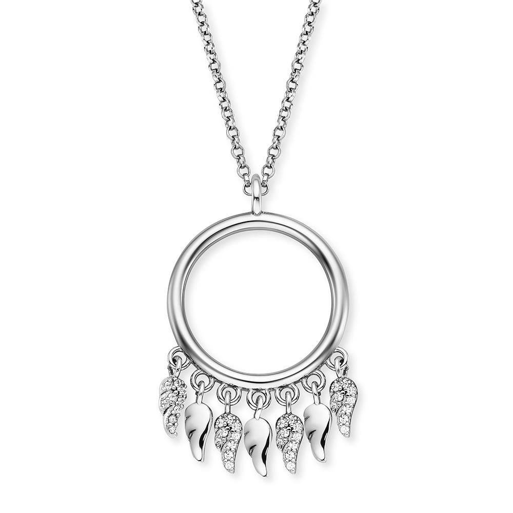 Angel Whisperer sterling silver flying wings necklace. An open circle pendant with seven hanging angel wings in plain sterling silver and others adorned with sparkling cubic zirconia. This pendant comes on a chain that can be worn at three different lengths, 42 + 4 + 4cm. Pendant size 18mm.