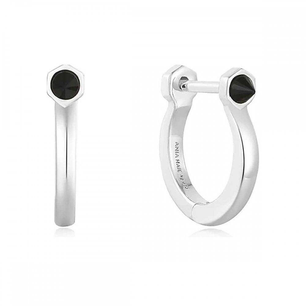 Your new season huggie update is here: our stunning rhodium-plated sterling silver and agate huggies. These sleek, angular silver hoops are finished with a chic black agate stud detail.