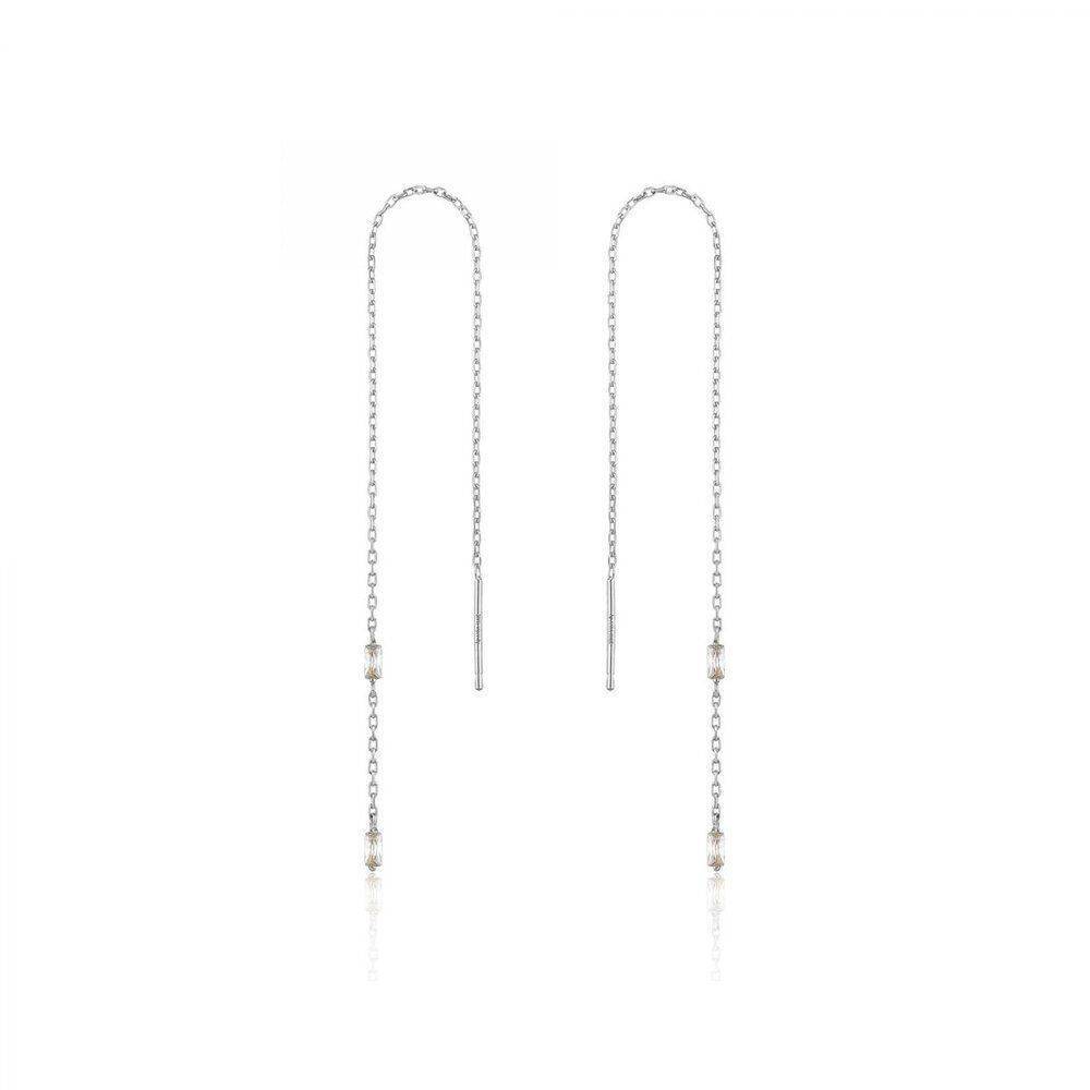 Ania Haie sterling silver glow earrings, a threader style earring with two sparkling cubic zirconia on each earring.