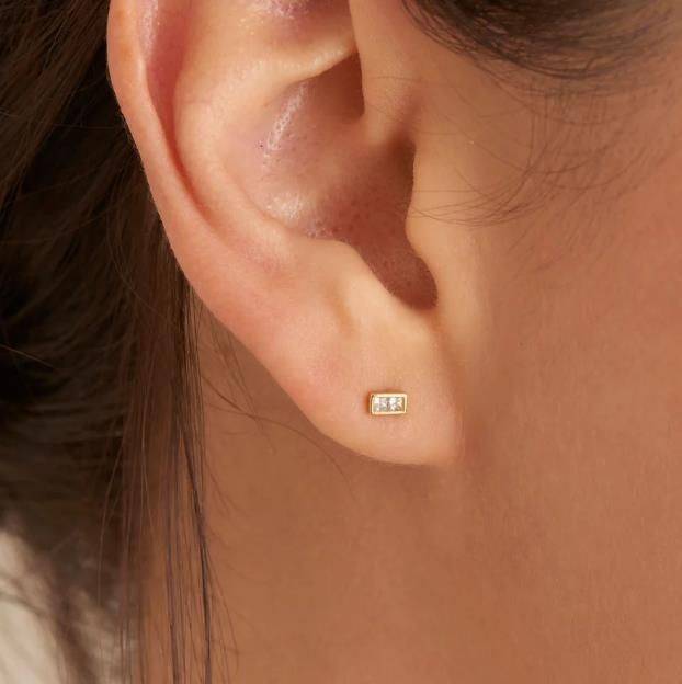 Craving some glam in your collection this season? Us, too. Try adding an edge to your ear party with these luxe cubic zirconia gold stud earrings. Mini in size but major when it comes to hitting the trends. Crafted in sterling silver with 14ct gold plating.