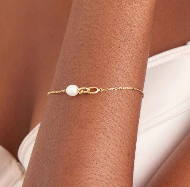 The epitome of chic styling, this stunning link chain bracelet encapsulates the aesthetic of the Pearl Power collection. Set on a delicate gold chain, a single iridescent pearl is paired with a chunky gold link detail. Sterling silver with 14ct gold plating.