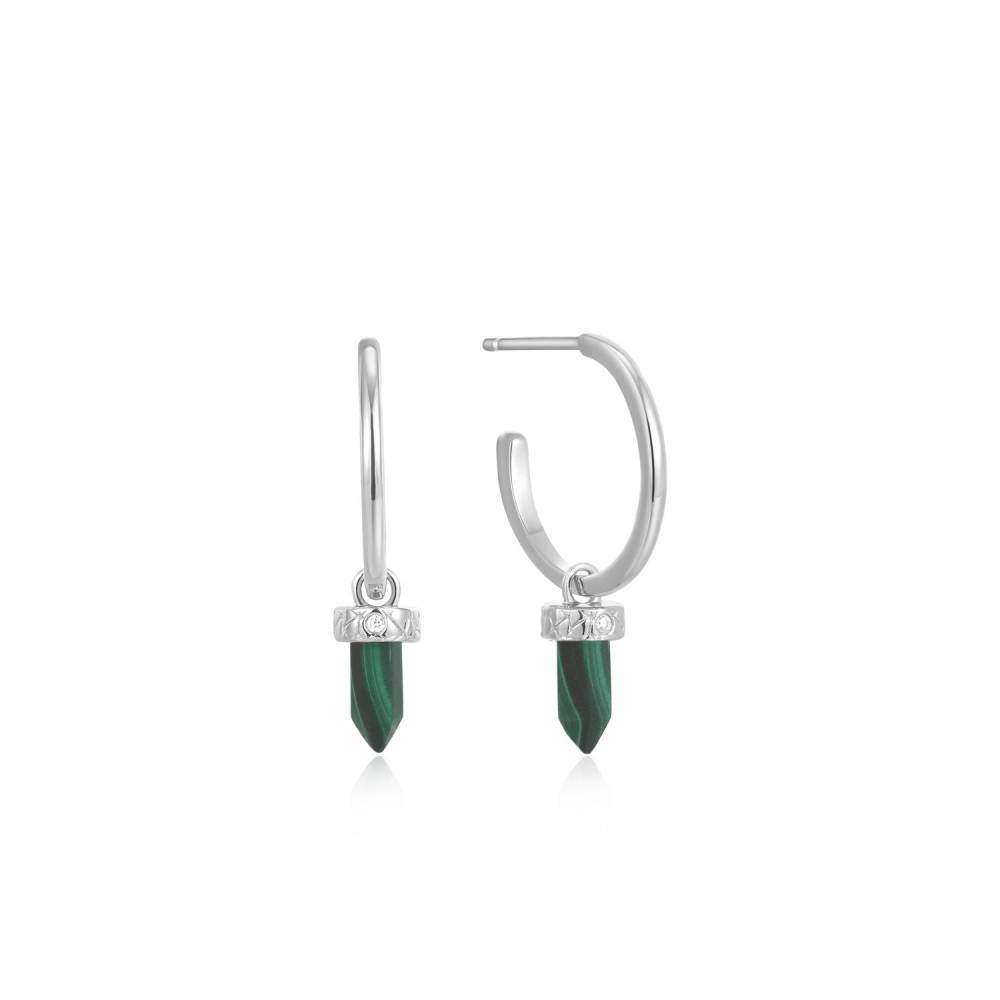 Ania Haie sterling silver hoop earrings with malachite point drops. Symbolising protection, wisdom and healing properties, the malachite serves up a pop of bold colour for the season ahead.