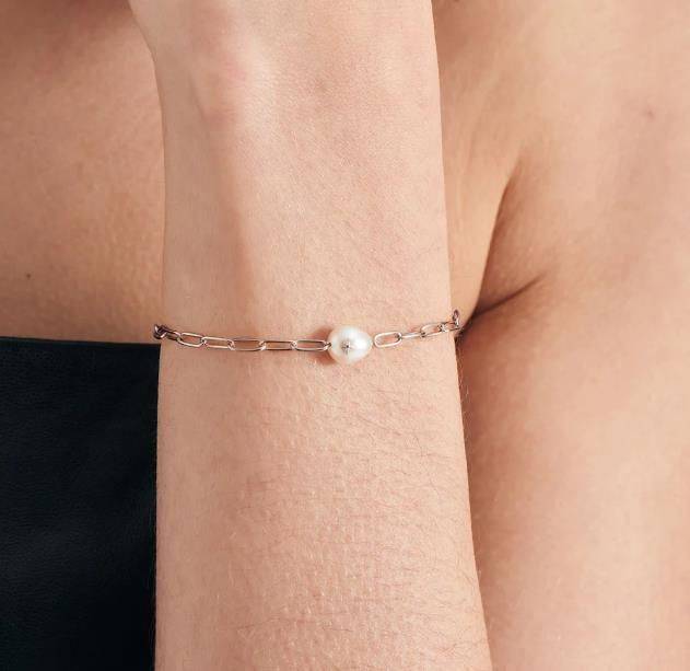Balancing the chunky chains trend with a chic pop of pearl, this stunning bracelet is a statement choice this season. Sleek sterling silver link chains are finished with a single iridescent pearl with extra silver detailing. The perfect play on this season’s trends with a timeless edge. Easy to style, wear yours solo or stack with others.