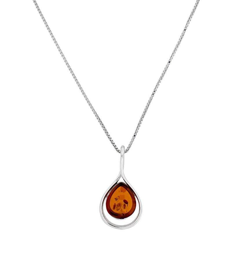 Azendi sterling silver teardrop shaped amber pendant on a 16-18″ silver chain. The bright cognac amber is set simply in a polished sterling silver figure-of-eight shape. Pendant length 25mm.