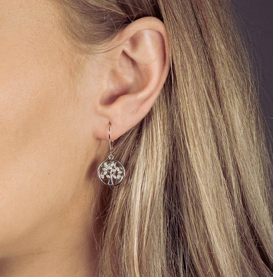 The tree of life symbolises good heath, a bright future and positive energy, These Azendi tree of life earrings are crafted in sterling silver and are set with sparkling cubic zirconia and have a continental drop earring fitting.