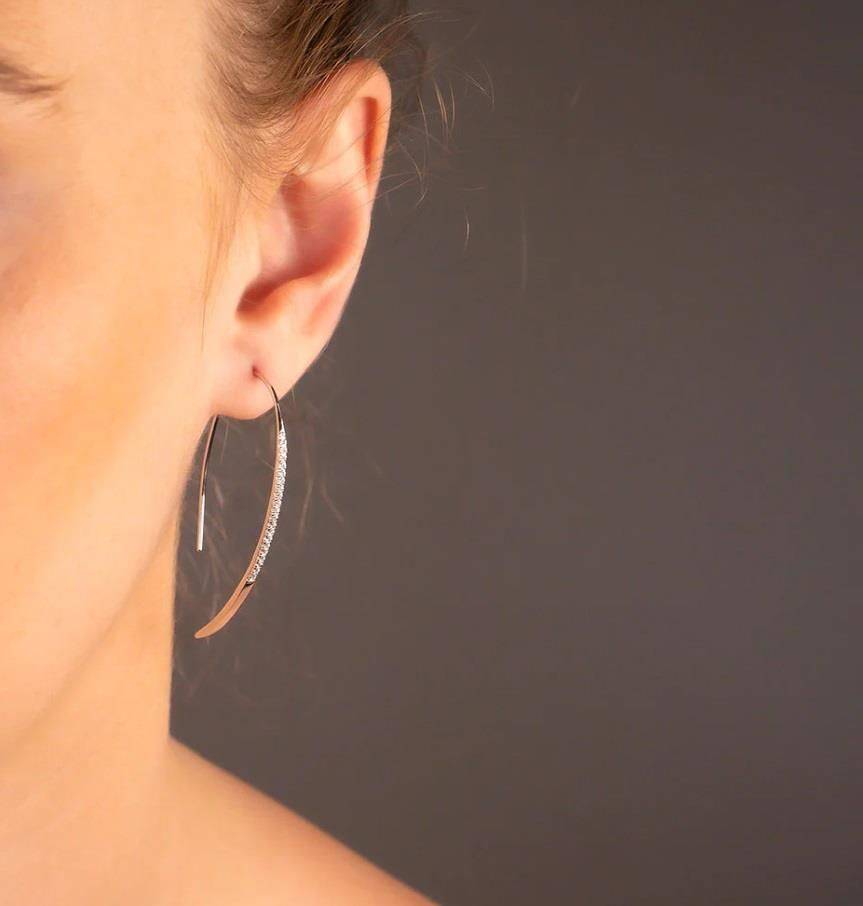 Azendi sterling silver hook through earrings set with sparkling cubic zirconia. These earrings have been designed so they balance perfectly in the ear. 50mm long.