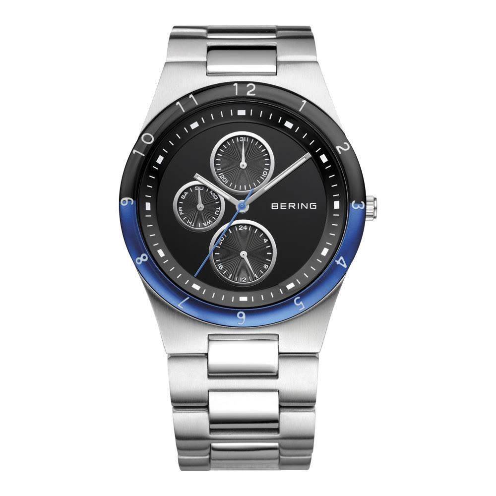 Bering gents stainless steel watch with a round black dial with three sub dials encased in a stainless steel case with a ceramic black and blue bezel on a stainless steel bracelet.