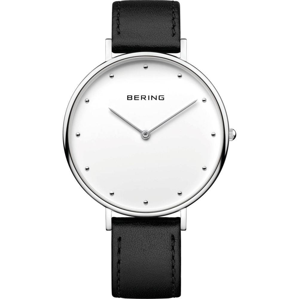 Bering ladies stainless steel watch with a large white simple dial on a slim black leather strap. Case 39mm.
