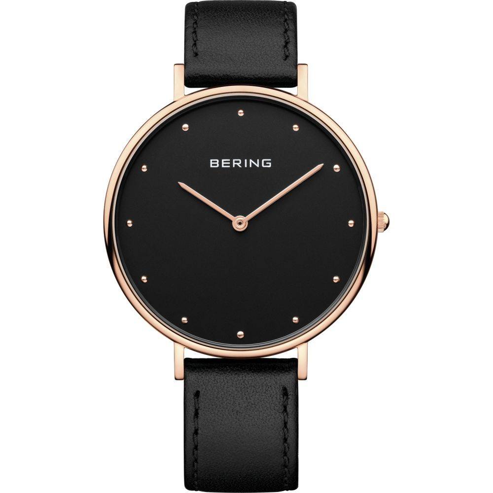 Bering ladies rose gold plated watch with a large black dial on a black leather strap. Case 39mm.
