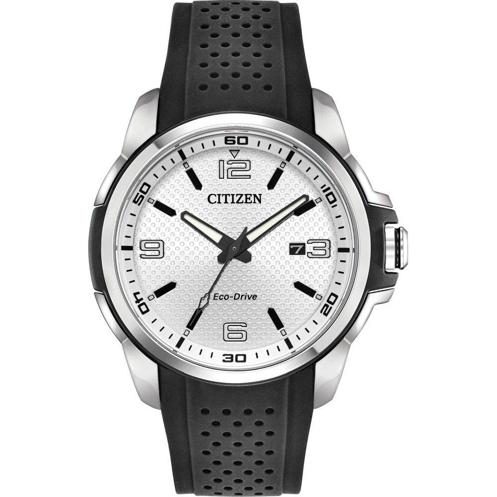 Citizen gents stainless steel watch with a round silver tone dial with black accents and a date window on a black rubber strap. Case size 45mm. This watch has an Eco Drive movement so is powered by light and will never need a battery.