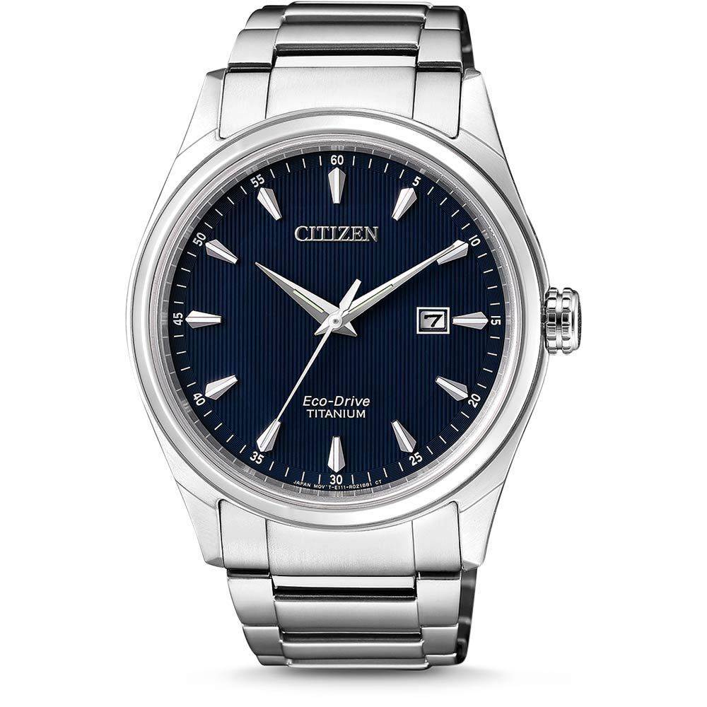 Citizen gents Super Titanium watch with a round blue dial with a date window on a titanium bracelet. Luminous hour and minute hands. This watch has a sapphire crystal glass and an Eco-Drive movement so is powered by light and will never need a battery. Case size 41mm.