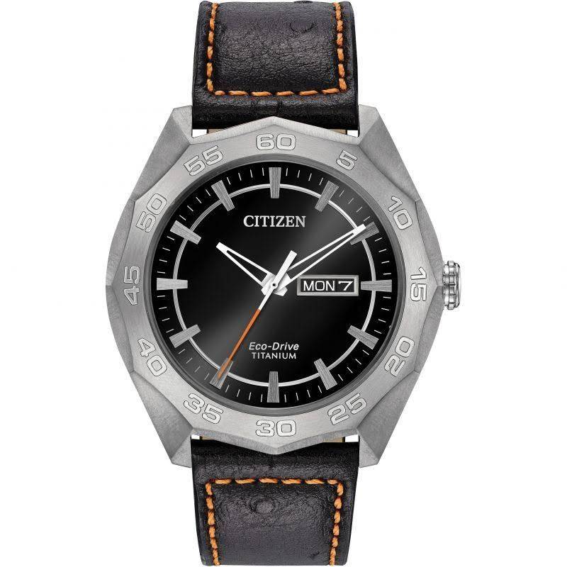 Citizen gents titanium watch with a round black baton dial with a day and date window on a black leather strap with orange stitching. It is all about design with the newest models in the Citizen Titanium family. Sculpted from a single piece of titanium, this Super Titanium™ timepiece is 40% lighter than stainless steel and 5 times harder to resist scratches. This watch has an eco drive movement so is powered by light and will never need a battery and comes with an official Citizen 5 year warranty.
