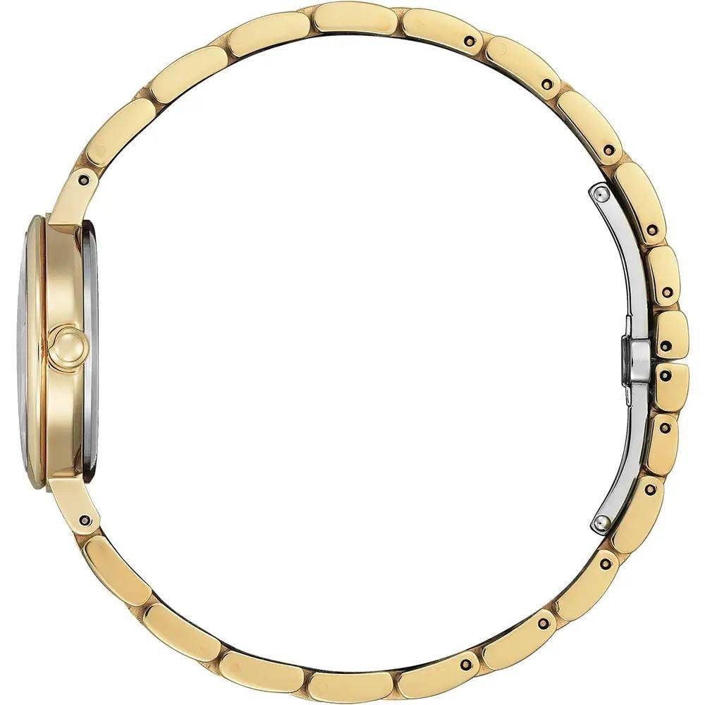 Citizen ladies gold tone stainless steel Silhouette watch with a round vibrant sea-green dial with matching bracelet and gold tone batons. This watch has a sapphire crystal glass and has an Eco Drive movement so is powered by light. 50m water resistant.
