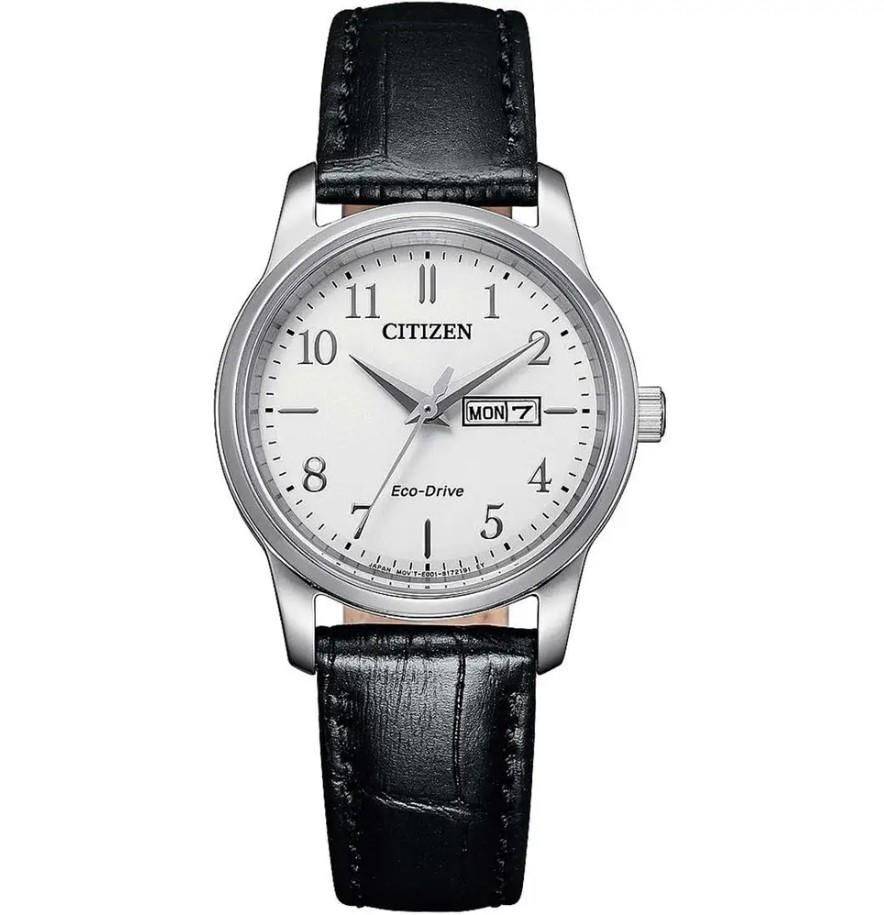 A timeless style that never goes out of fashion, this everyday ladies Citizen timepiece features a clean white dial with easy to read silver-tone numerals and a stylish black leather strap. The day and date is displayed at the 3 o’clock position. Featuring Citizen Eco-Drive technology – powered by light, any light. Never needs a battery. 30mm case.