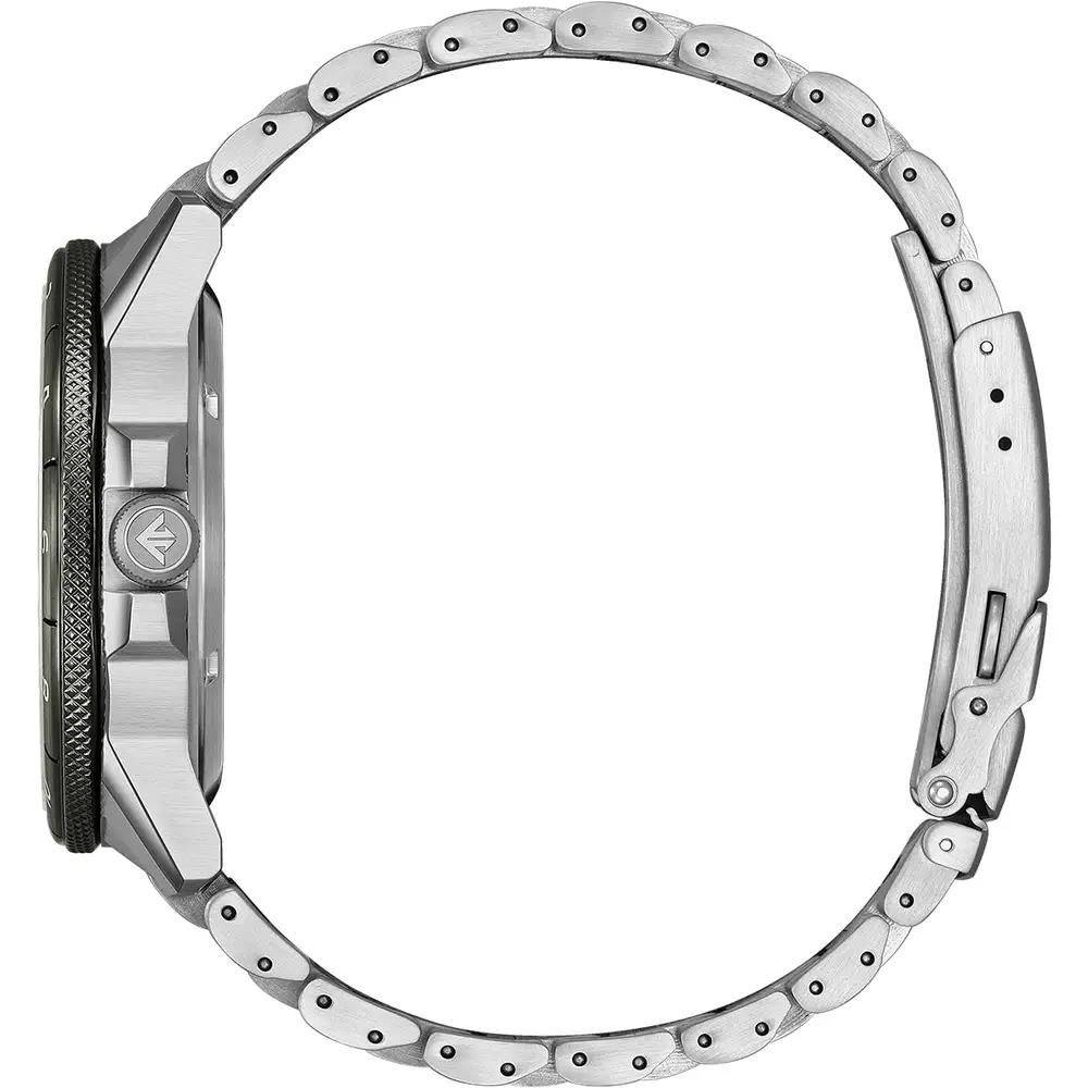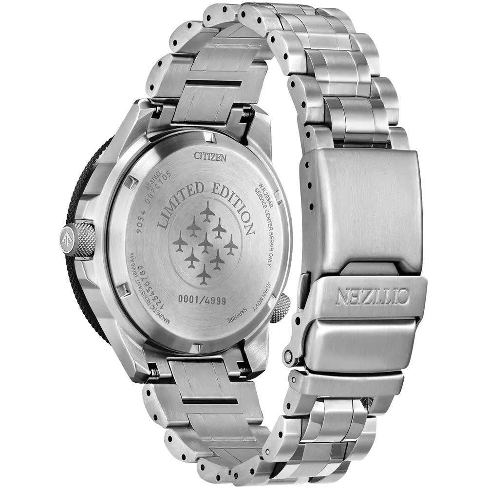 In celebration of the RAF Red Arrows 60th Display Season, Citizen is proud to present the latest addition to its Red Arrows collection. The Limited Edition Red Arrows Promaster Automatic GMT flight-ready timepiece is a mission-focused powerhouse, featuring a sturdy construction stainless steel case with a 24-hour bezel and two bold crowns to match. Luminous hands and markers contrast against a black sunray dial accompanied by the official RAF Red Arrows logo. An aeronautical slide-rule scale surrounds the display and is operated by an 8 o’clock crown and a red-accented 24-hour hand which can be used to display two different time zones simultaneously. Inside this timepiece is the Citizen Calibre 9054, an automatic mechanism featuring a 50-hour power reserve and magnetically resistant up to 16000 A/M to maintain accuracy. This timepiece is limited to 4,999 pieces worldwide, features the iconic Diamond Nine engraved on the case back and is presented in a limited edition box with plaque and model Corgi Red Arrows plane. Stainless steel with an anti reflective sapphire crystal glass. 200m water resistant.