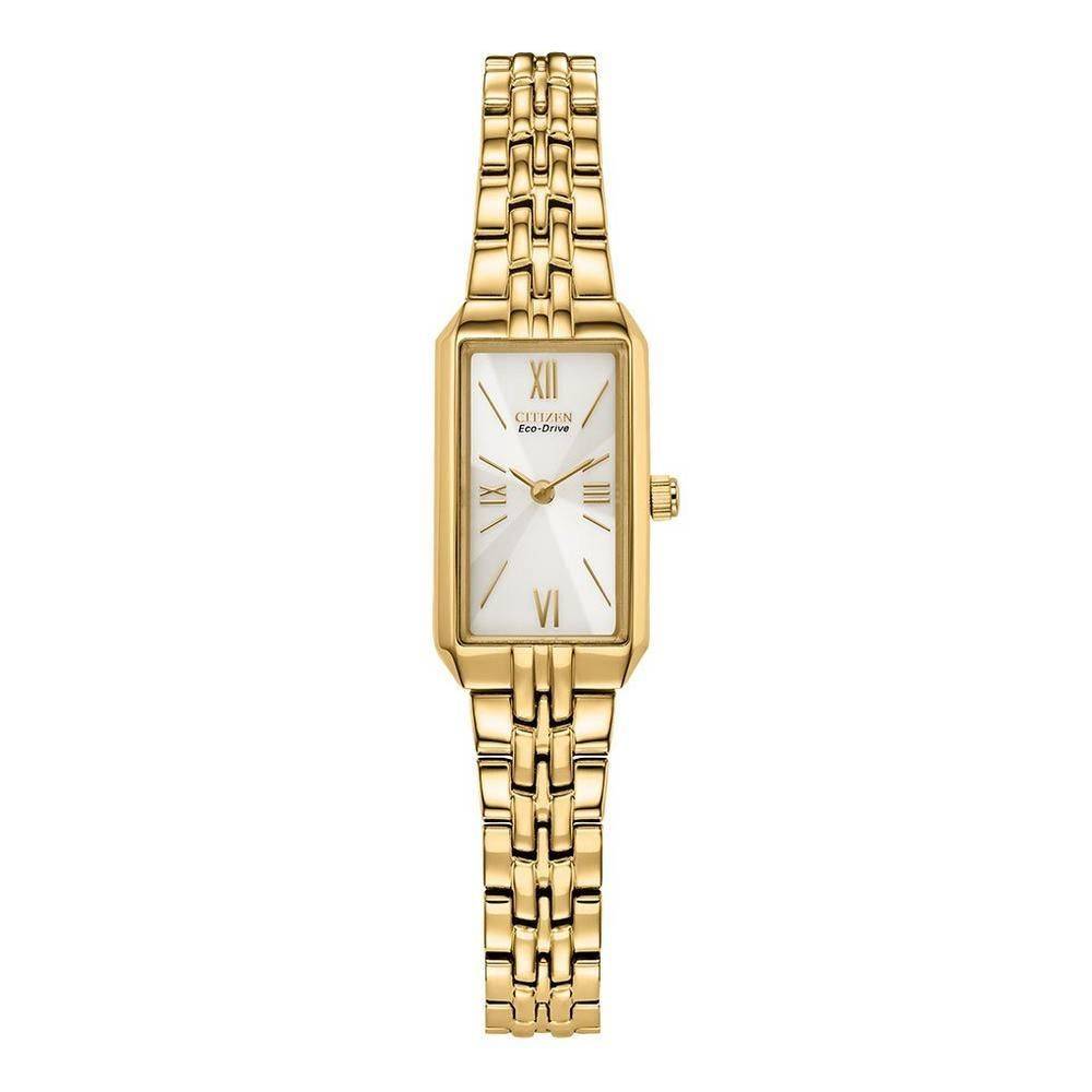 Complete every look with this Citizen Silhouette 26mm Yellow Gold Tone Eco Drive Ladies Watch. Crafted in gold-tone stainless steel, the rectangle case creates a beautifully elegant essence that will complement your sophisticated style.