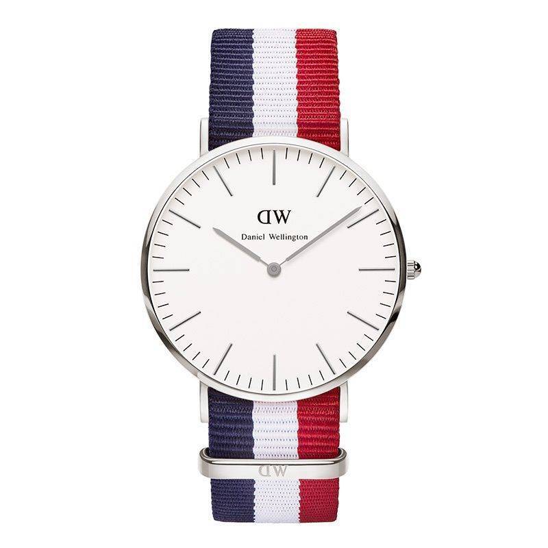 This Daniel Wellington gents stainless steel watch features a round white dial with silver tone batons and hands and is on a navy, white and red fabric nato strap. Case 40mm.