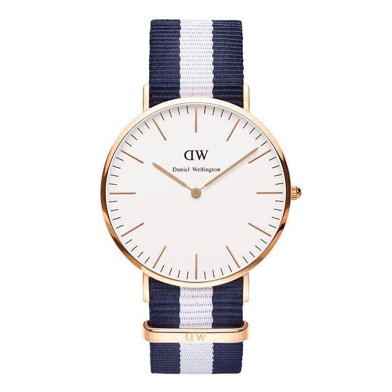 This Daniel Wellington rose gold plated watch features a round white dial with silver tone batons and hands and is on a navy and white nato strap. Case 40mm.