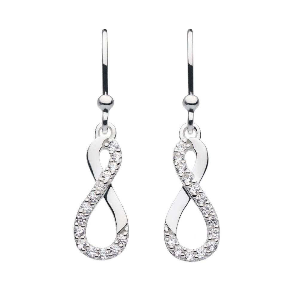 Dew sterling silver infinity drop earrings set with cubic zirconia with hook through fittings.