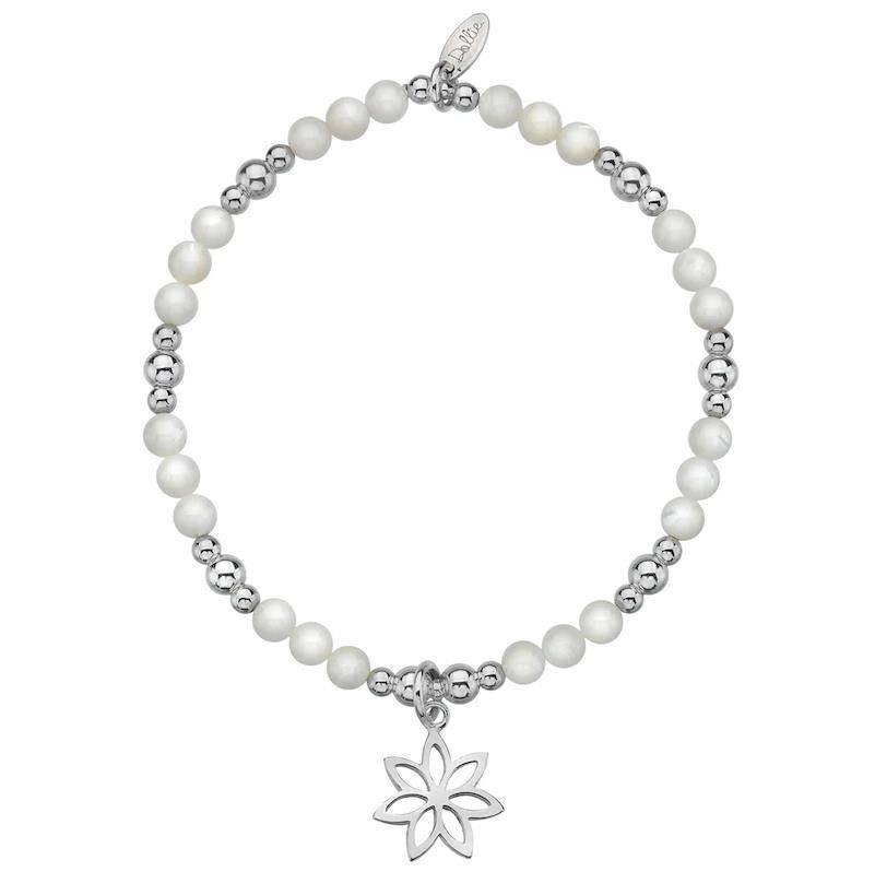 Dollie sterling silver diamond cut bead and mother of pearl bead bracelet with a beautiful open flower charm. Elastic bracelet making it really easy to wear and take on an off. Style with other Dollie bracelets to create your own unique stack.