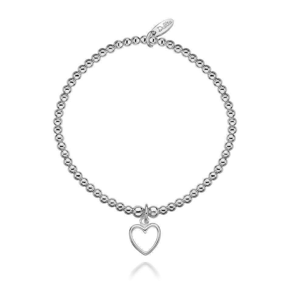 Dollie sterling silver beaded bracelet with an open heart charm. Perfect for stacking with other Dollie bracelets.