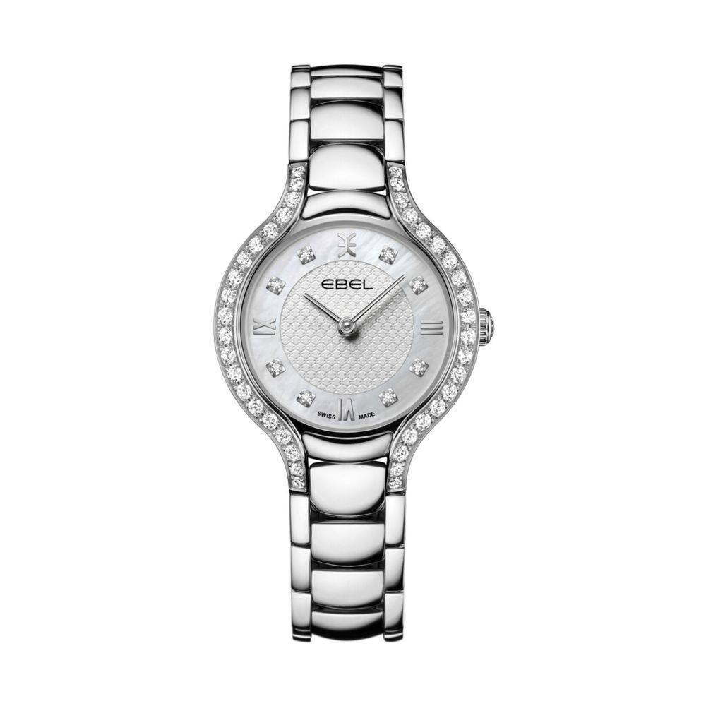 Ebel ladies Beluga stainless steel watch with forty diamonds set in the bezel and lugs, with a mother of pearl, silver stamped centre dial with eight diamonds. This watch has a sapphire crystal anti reflective glass, a polihsed stainless steel bracelet and is powered by a Swiss quartz movement.
