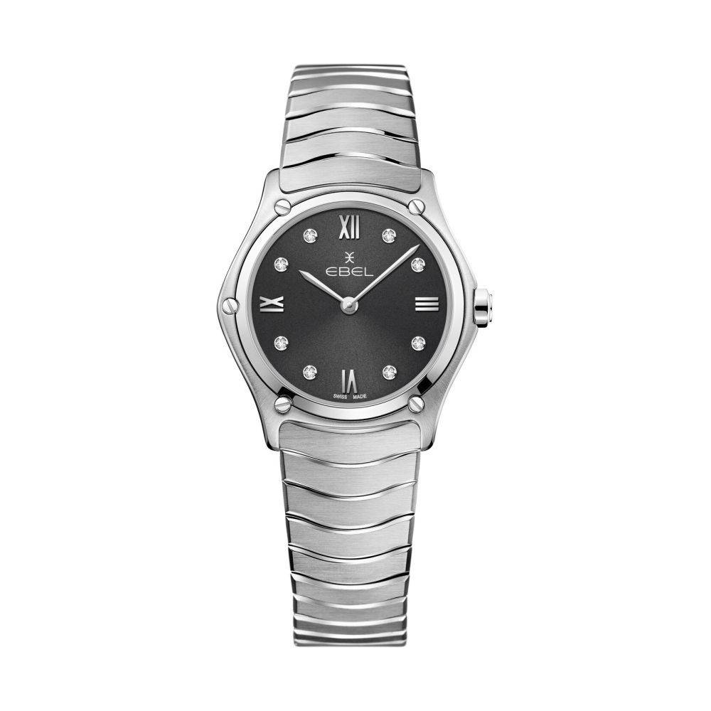 Ebel ladies stainless steel Sport Classic watch. This watch has a round grey diamond dot dial with some roman numerals and is on an iconic Ebel wave link bracelet. Case 29mm. Powered by a Swiss quartz movement with an anti reflective sapphire crystal glass.
