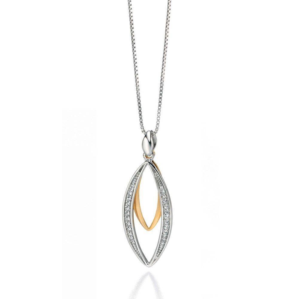 This Pendant from Fiorelli features two open marquise shapes, one in silver adorned with cubic zirconia and the other gold plated on a 41-46cm adjustable chain. Add a flash of gold to your outfit with this double marquise pendant.
