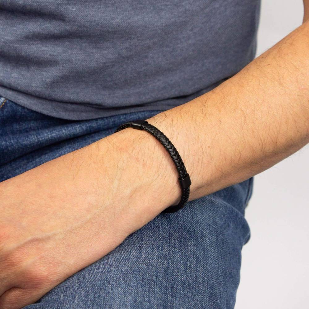 Fred Bennett plaited black leather bracelet with a black IP coated stainless steel catch and sections. Length 21cm.