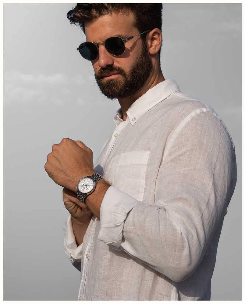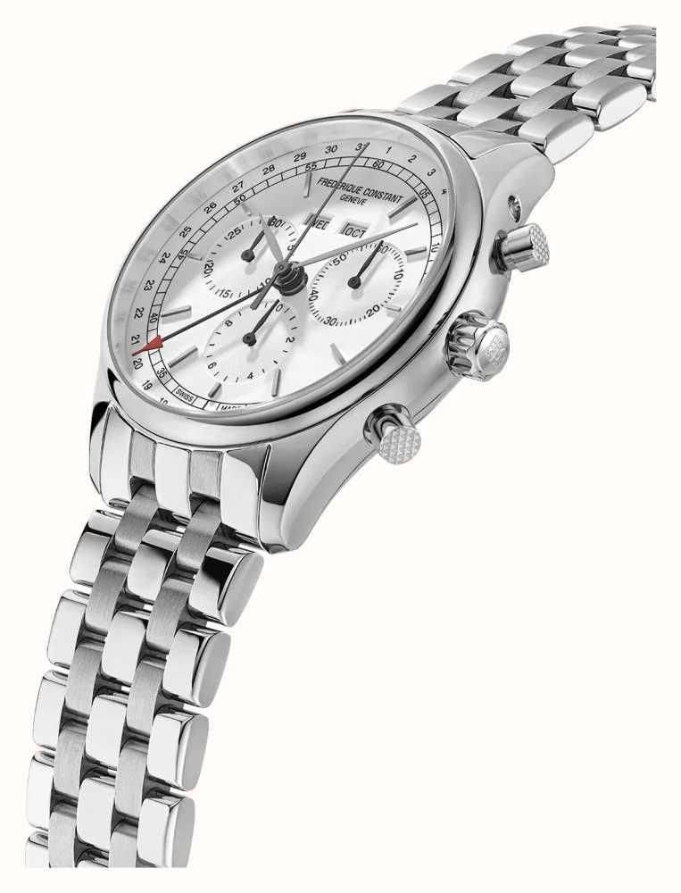 Frederique Constant gents triple calendar chronograph watch. This 40mm stainless steel case watch features a white dial with a sunray finish, chronograph function, month and day window at 12 o’clock. This watch has a polished stainless steel bracelet. Swiss quartz movement, sapphire crystal glass and water resistant to 30m.