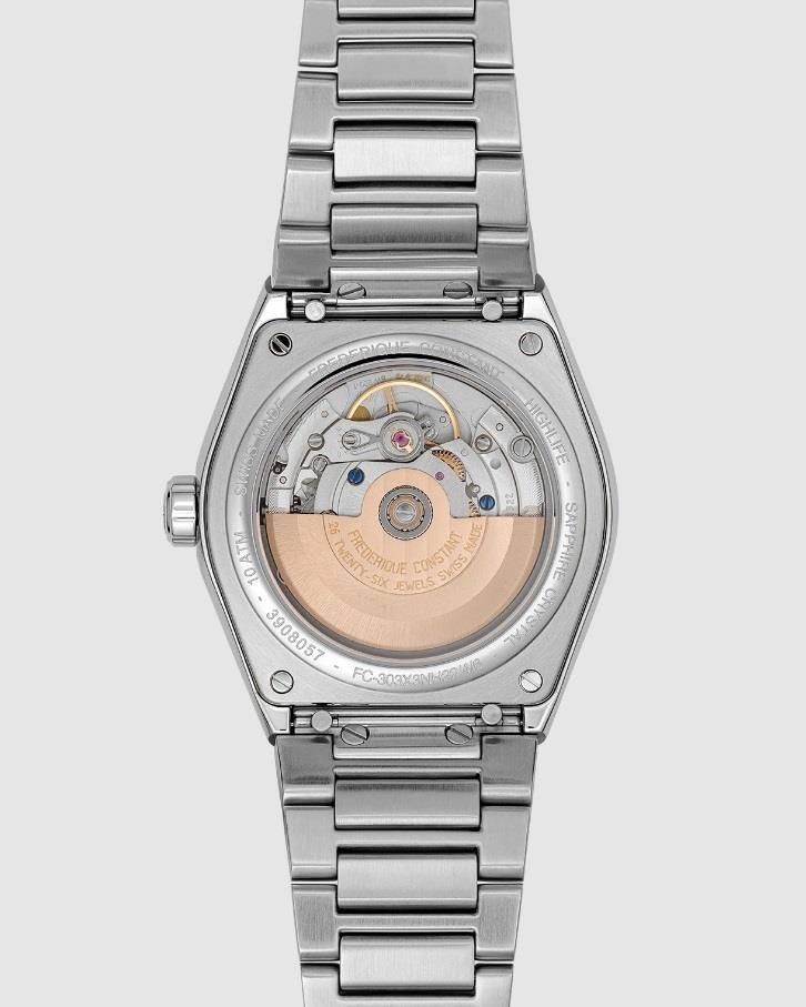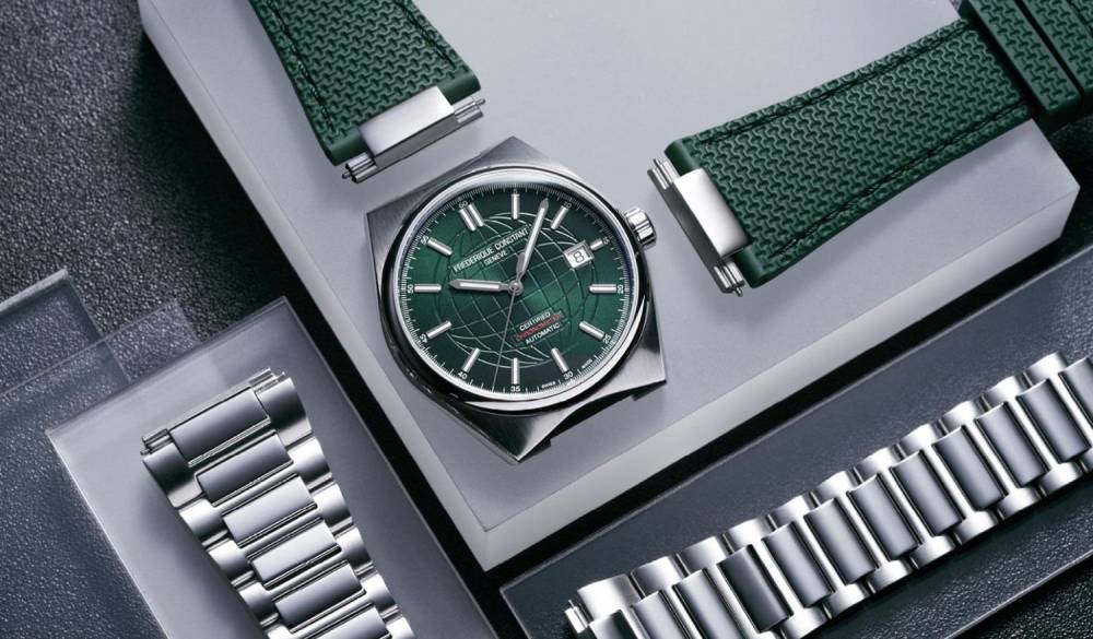 Gents Frederique Constant Highlife watch with a British racing green dial embossed with a globe in the centre. Rarely are watches certified by the COSC (Official Swiss Chronometer Testing Institute). This certificate is only issued to pieces that can guarantee perfect isochronism over a given time and at given positions – in effect, their ability to tell the time correctly, consistently and precisely, within the strict limits enforced by an ISO standard. The COSC is an independent Swiss organisation that only issues its chronometer certificates to these pieces after the watches have undergone numerous tests over several days. COSC certified pieces form an elite, a class of their own, intended for collectors for whom “Swiss precision” is an everyday necessity. The Highlife Automatic COSC was developed especially for them. This watch comes on the stainless steel bracelet and also comes with an addition green rubber strap. 39mm case. 100m water resistant.