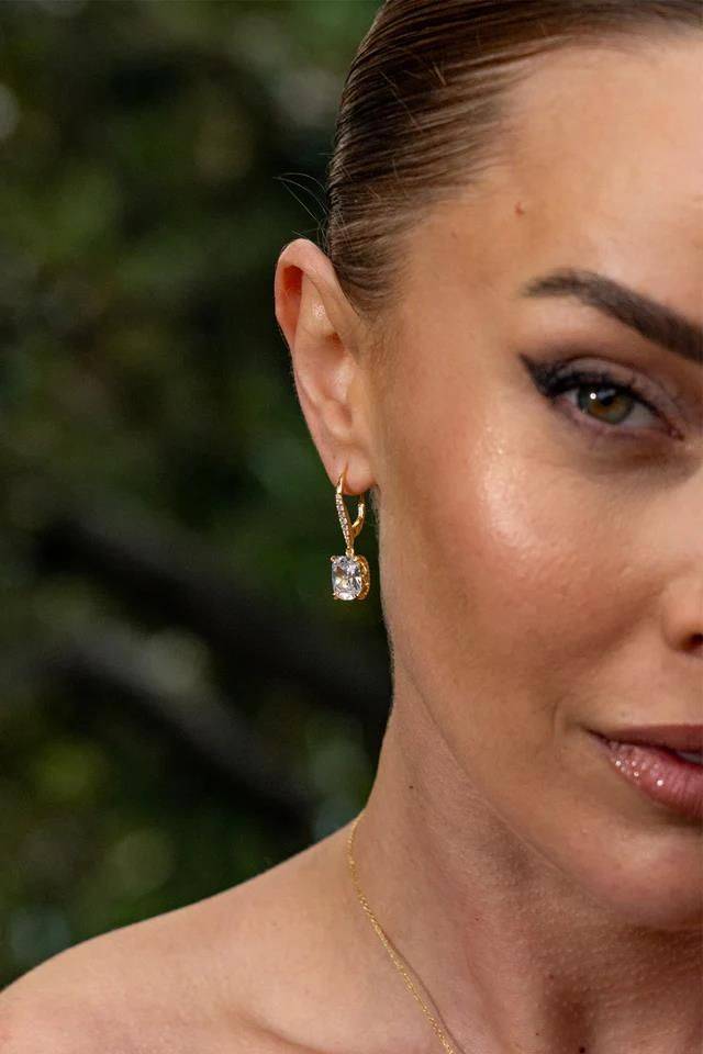 Each earring features a 10x8mm elongated cushion-cut cubic zirconia, masterfully crafted to catch and reflect light with every movement. These exquisite stones are securely set in an intricately detailed, stone-encrusted basket, adding an extra touch of artistry to the design. These earrings are crafted in 18ct gold plated on sterling silver and each measure 29.5cm with a lever back making them secure and easy to take in and out.