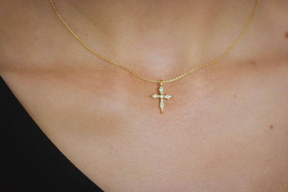 Georgini gold plated mini cross pendant set with cubic zirconia on a 41-46cm chain. Cross size 14mm.