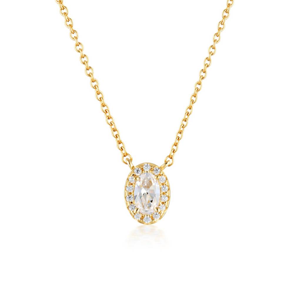 Georgini gold plated oval cubic zirconia halo pendant fixed on a gold plated chain. Length 41-46cm. Made from 18ct gold plated on silver.