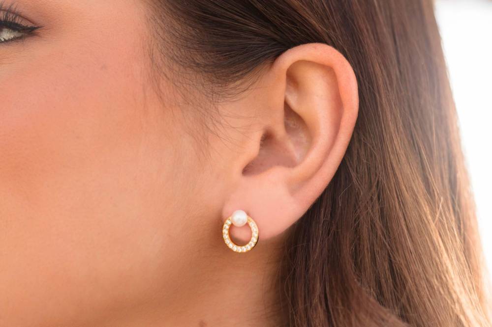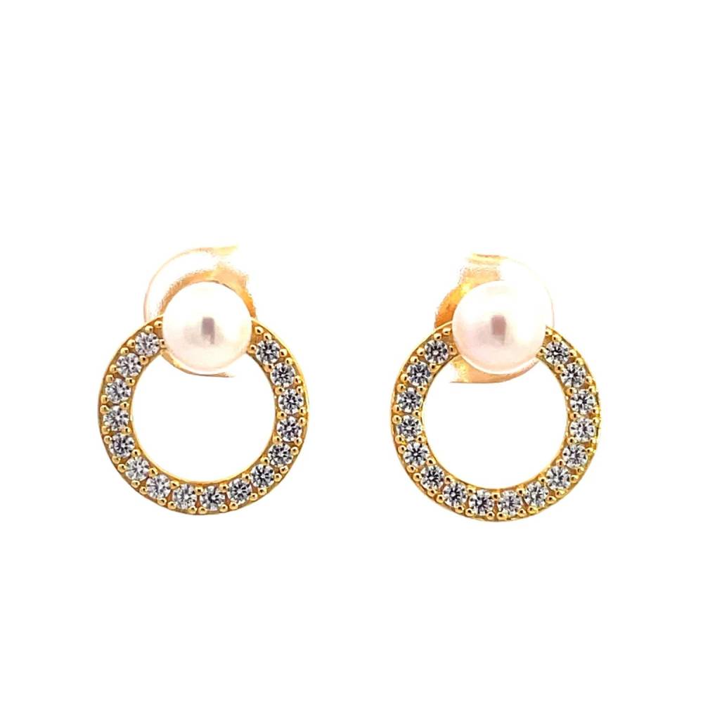 Georgini gold plated open pave cubic zirconia circle and freshwater pearl stud earrings. These earrings are 18ct gold plated on sterling silver.